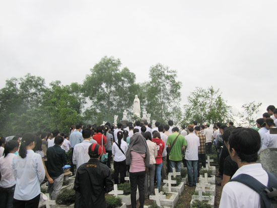 Rời nhà xứ chúng tôi tiến vào nghĩa trang nằm heo hút bên sườn đồi và bên cạnh dòng Hương giang cô quạnh, ở đó có hàng chục ngàn thai nhi vô tội được chôn cất - những sinh linh bé nhỏ chưa có ngày sinh đã có ngày tử.