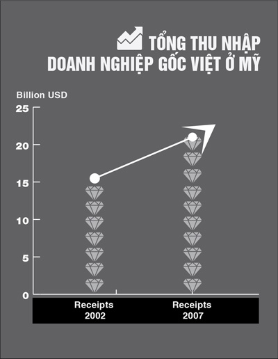 Cũng theo bản tường trình năm 2007 của SOB, số cơ sở thương mại của người gốc Việt lên tới 229,000, tương đương 15% của toàn bộ di dân gốc Á, với doanh thu $28.8 tỷ một năm.