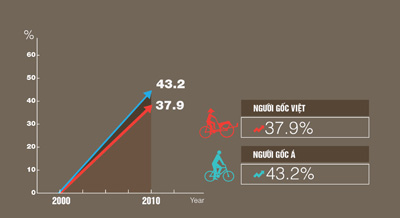 Trong 10 năm, từ 2000 đến 2010, cộng đồng gốc Việt tăng 37.9% dân số, thấp hơn các sắc dân gốc Á khác. (Hình: Khoa Vũ/Người Việt) |