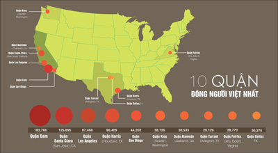 WESTMINSTER -Cộng đồng Việt Nam tại Hoa Kỳ có tổng cộng 1,548,449 người, theo công bố chính thức của thống kê dân số 2010 (Census 2010). 10 quận có cộng đồng gốc Việt lớn nhất Hoa Kỳ, theo thống kê dân số Census 2010. Cả 3 quận đứng đầu đều thuộc về tiểu bang California. (Hình: Khoa Vũ/Người Việt) |