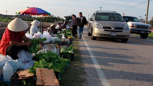 Ở Mỹ, “chợ Việt” rất nhiều, từ các cửa hàng nhỏ đến những siêu thị bán đủ loại “đặc sản” Việt Nam. Nhưng một cái chợ chồm hỗm ở Houston ngay lề đường bán mớ rau, con cá có lẽ rất hiếm. Đến đây mọi người như trở về với cái “chợ lề đường” ở Việt Nam. Vẫn những cái ghế đòn nhỏ, những chiếc nón lá, áo bà ba, lại nghe được tiếng kỳ kèo trả giá của người mua, người bán...