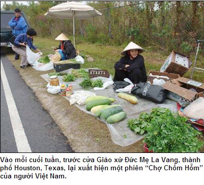 6g30 sáng, chiếc Acura bóng lộn đời mới nhất đỗ xịch ở ven đường. Một ông già từ trong xe khệ nệ bưng thùng giấy đựng mấy bó rau bỏ xuống. Cạnh đó, mấy bà già cũng tất bật lôi từ xe hơi của mình những trái mướp, quả bầu, mớ chanh, ớt, đậu bắp... để bày biện. Mỗi sáng chủ nhật, phiên chợ chồm hỗm ở Houston của người Việt lại được bắt đầu như thế ở thành phố Houston, bang Texas, Mỹ.