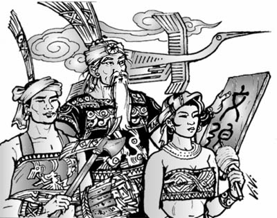 [14] Phục Hy, đặt ra bát quái, căn bản của Kinh Dịch. Thần Nông: tổ nghề nông và dược thảo. Hoàng Đế: biểu tượng của vua đất màu vàng (Hoàng). Đất vàng có tên khoa học là loess, chính là đất bồi do gió mang đến. Ở Trung thổ có lớp dày đến 3 thước. Rất phì nhiêu bởi nước thẫm dễ dàng. Người Hoa cho dân tộc họ mang mạng Thổ, màu vàng, ở miền chính giữa: Trung. Bởi vậy nước của họ gọi Trung Hoa hay Trung Quốc. Thời xưa, nếu đối chiếu với bên ngoài họ vẫn gọi đất của họ: Trung nguyên. Thí dụ, trong truyện của Kim Dung, giới giang hồ ưa hỏi nhau: ‘Không biết tin đồn Tạ Tốn đã trở lại Trung nguyên có thật hay không’. Hiện diện của bà Nữ Oa, được sắp xếp rất lộn xộn, chỉ chứng tỏ giai đoạn cổ thời theo Mẫu hệ của Hoa chủng. Theo đó bà Nữ Oa đáng lẽ phải được sắp xếp trước tiên. Điển hình, Thái Dương Thần Nữ của dân tộc Phù Tang bị kẹt cứng thành mẫu tổ của dân Nhật. Dân Trung Hoa xưa sau khi chuyển qua Phụ hệ đã thay đổi thứ tự và đưa bà Nữ Oa xuống.