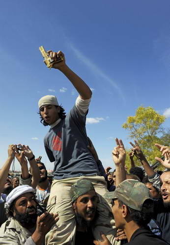 Các binh sĩ NTC công kênh một đồng đội với khẩu súng ngắn bằng vàng mà người này nói lấy được từ ông Gaddafi - Ảnh: AFP |