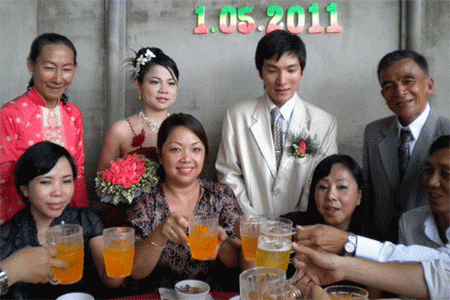Chị Thanh (hàng đầu tiên, thứ hai bên phải) tham dự tiệc cưới của một cô dâu được chị tư vấn thành công không phá thai.