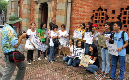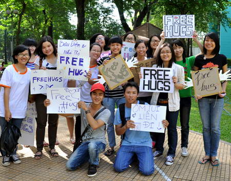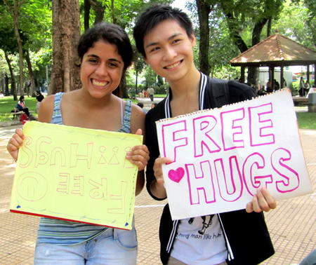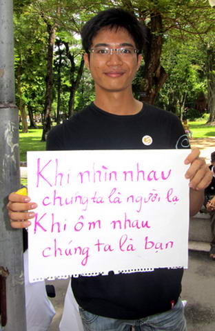 Một tình nguyện viên với khẩu hiệu: "Khi nhìn nhau chúng ta là người lạ, khi ôm nhau chúng ta là bạn". Hoàng Linh, chủ tịch Free Hugs Việt Nam cho biết: "Ngày hội International Free Hugs Day 2011 nhằm kết nối, tạo điều kiện để đưa mọi người lại gần nhau, kích hoạt sự đồng cảm ẩn giấu, khơi dậy niềm vui và nhân rộng trong cộng đồng".