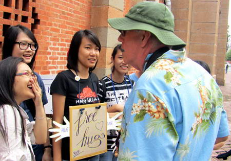 Các tình nguyện viên đang giải thích ý nghĩa chương trình với một khách du lịch. Sau cái ôm, họ quen nhau và chụp hình làm kỷ niệm.