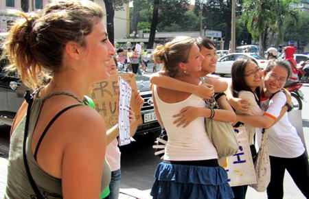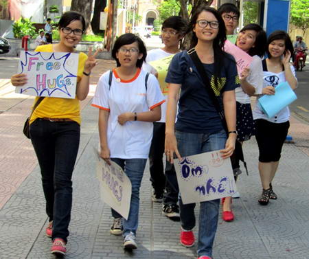 Các tình nguyện viên đi bộ suốt mấy tiếng đồng hồ dọc theo những khu vực trung tâm TP HCM để mời "ôm".
