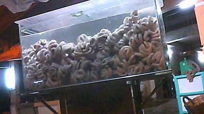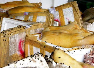 | ‘Phù phép’ lòng heo thối Qua nhiều đêm theo dõi, phóng viên phát hiện một đường dây chuyên vận chuyển và chế biến nội tạng heo thối để đưa đi tiêu thụ nhiều nơi tại Tp.HCM. ![]() Nghĩa - người làm công cho ông Tuấn “dồi trường” - nhận lòng heo thối tại bến xe “cóc” ở khu vực cầu vượt Sóng Thần - (Ảnh chụp từ camera) Giao hàng trong đêm Đêm cuối tháng 3, chúng tôi có mặt tại bến xe “cóc” ở khu vực cầu vượt Sóng Thần (giáp ranh giữa Tp.HCM và Bình Dương). Khoảng 1g sáng, một xe khách từ Thanh Hóa đỗ lại, bốn thanh niên khệ nệ khiêng xuống năm thùng xốp loại lớn. Tất cả đều được bịt kín bằng băng keo. Phương (quê Cần Thơ) chạy xe Wave cùng một thanh niên tóc dài tên Nghĩa chạy xe Dream đến nhận hàng. Tất cả thùng xốp được kéo sát lề đường, khuất sau bóng tối để sang hàng. Không cần giấu giếm, Nghĩa và Phương dùng dao rạch quanh thùng xốp ngay trước mặt chúng tôi. Khi nắp thùng xốp được mở lên, trong đó toàn là nội tạng heo, mùi hôi thối bốc lên nồng nặc. Trong thùng xốp có đủ lòng heo, vú heo, dồi trường... được Nghĩa và Phương dùng tay bốc từ thùng xốp tống vào các bao tải lớn. Phương nói: “Hàng này chở về công ty ở tận sân bay. Khi giao hàng chỉ biết nhập vào kho, không biết ở đâu chuyển vào. Phải chuyển hàng qua bao tải chứ không đi dọc đường dễ bị phát hiện”. Nước thối từ các thùng xốp chảy tràn ra đường. Một người dân gần đó quát lớn: “Các anh sang hàng thì đi nơi khác, toàn thịt thối ai mà chịu được”. Nghĩa vội vàng đáp: “Dạ, dạ... Tí nữa em chở ra đầu kia đổ”. Sau khi chuyển lòng heo qua hết bao tải, Nghĩa chất mấy thùng nước thịt thối lên chiếc xe Dream và chở đi đổ ngay trước cổng Khu công nghiệp Sóng Thần. Đến khoảng 2g sáng, năm bao tải lòng thối được chất lên hai xe máy chạy về hướng chợ Bình Điền. Đêm hôm sau, cũng tại khu vực bến Sóng Thần, xe khách 50 chỗ đỗ lại. Thêm bốn thùng xốp lớn được khiêng xuống xe. Hôm nay chỉ có Nghĩa đến nhận hàng. Vẫn như cũ, loại lòng heo bốc mùi hôi thối được chuyển sang các bao tải lớn. Nghĩa cho biết: “Lô hàng này từ Ninh Thuận, Bình Thuận chuyển vào”. Toàn bộ bốn thùng xốp lòng heo được bỏ vào hai bao tải căng cứng và hai giỏ xách lớn treo hai bên xe máy. Nghĩa lắc đầu: “Hôi lắm, khi về phải tắm cả cục xà bông chưa hết mùi. Hôi chịu không nổi”. Không bao lâu sau, lại thêm một xe khách chở hơn năm thùng xốp đựng thịt heo cập bến. Cả năm thùng được đưa lên xe ba gác chở về quận 8. Trước đó mấy bữa, cũng chính chiếc xe khách này đã hai lần vận chuyển thịt heo thối để giao cho khách trong khu đường vắng của Khu công nghiệp Sóng Thần. ![]() Dồi trường thối được đưa về cơ sở của ông Tuấn ở quận 8 (Tp.HCM) vào đêm 6/4 - (Ảnh chụp từ camera) Điểm chế biến của Tuấn “dồi trường” Theo điều tra, thịt heo, lòng heo thối được các cơ sở chế biến đặt hàng với giá rẻ. Sau khi được xử lý, các cơ sở này mang đi bỏ mối cho các nhà hàng, quán nhậu. Tuấn “dồi trường” là một chủ nhận hàng có tiếng. Ông Tuấn có nhà ở đường Nguyễn Quý Yên (thuộc khu phố 4, P.An Lạc, Q.Bình Tân). Theo lời Phương - người làm cho ông Tuấn, hàng được chuyển đến kho ông Tuấn “dồi trường” ở Q.Bình Tân. Mỗi thùng xốp được chở đến khu vực Sóng Thần, ông Tuấn phải trả 250.000 đồng cho tài xế xe khách. Nhà ông Tuấn khoảng 120m2. Phía sau nhà có hàng chục thùng xốp, thùng nhựa màu đỏ loại lớn được đánh số và khóa cẩn thận. Điểm chế biến lòng heo rộng chừng vài chục mét vuông, nằm cạnh một ao nước màu đen kịt. Xung quanh nhà ngổn ngang thùng xốp. Toàn bộ nước chế biến lòng heo được tống thẳng xuống ao nước cạnh nhà. Bà Thủy, một người phụ việc ở đây, cho biết: “Cần gì cũng có, mối mang của anh Tuấn nhiều lắm...”. Theo ghi nhận, hầu hết nội tạng heo khi chế biến đều được tẩy thối bằng hóa chất. Nếu mùi hôi ít, sẽ được ngâm trong thuốc tẩy hai giờ. Còn mùi hôi quá nặng thì ngâm trong thuốc tẩy hơn năm giờ. Khi đổ thuốc tẩy vào lòng thối, mùi hôi nồng nặc sẽ bốc lên và lòng thối dần chuyển sang màu tươi rói. Nếu lòng heo, dồi trường đã ướp đá thì phải luộc qua trước khi ngâm thuốc tẩy. Nội tạng heo sau khi ngâm thuốc tẩy sẽ bị giảm trọng lượng do bị tẩy mòn, cứ 100kg sau khi ngâm tẩy chỉ còn được khoảng 70kg thành phẩm. Tẩy xong, ông Tuấn cho người đem đến các cơ sở kinh doanh của mình hoặc đi bỏ mối tại các nhà hàng, quán nhậu trong TP. Có những thời điểm ông Tuấn bán ra thị trường cả tấn dồi trường, lòng heo một ngày. Ngày 6/4, chúng tôi tiếp cận một điểm bán dồi trường của ông Tuấn trên đường B2, khu dân cư Bến Lức, P.7, Q.8 (cách chợ Bình Điền khoảng 100m). Dồi trường được đưa về khu vực khá nhiều. Ông Tuấn bán dồi trường với giá 175.000 đồng/kg với ha