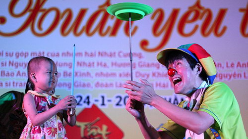 Chú hề người Nhật diễn hài cùng bệnh nhi tại Bệnh viện Ung bướu TP.HCM dịp xuân Giáp Ngọ 2014 - Ảnh: Hữu Khoa