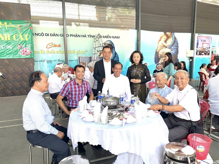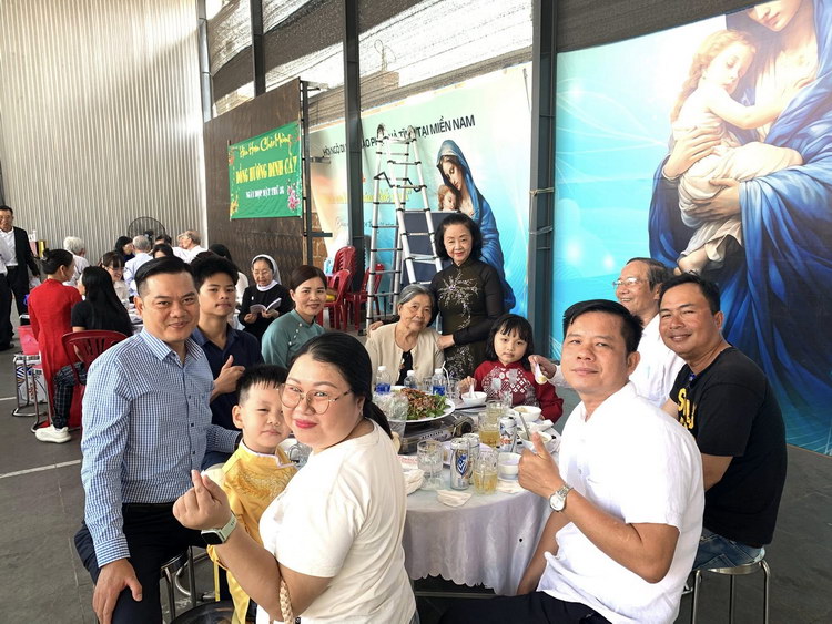 Niềm vui ngày hội được tiếp nối với bữa tiệc liên hoan. Khởi đầu là lời cám ơn của niên trưởng 90 xuân xanh Anrê Lê Thiên Sĩ gởi đến quý cha, quý sơ, ca đoàn và quý bà con đồng hương đã dành thời gian quý báu và không quản ngại đường xá khó khăn để đến tham dự hôm nay. Tiếp đến là màn tặng quà mừng tuổi quý cha và quý trưởng lão. Như thường lệ, có mục quyên góp cho quỹ hỗ trợ Ơn gọi.