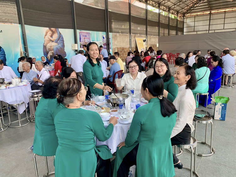 Niềm vui ngày hội được tiếp nối với bữa tiệc liên hoan. Khởi đầu là lời cám ơn của niên trưởng 90 xuân xanh Anrê Lê Thiên Sĩ gởi đến quý cha, quý sơ, ca đoàn và quý bà con đồng hương đã dành thời gian quý báu và không quản ngại đường xá khó khăn để đến tham dự hôm nay. Tiếp đến là màn tặng quà mừng tuổi quý cha và quý trưởng lão. Như thường lệ, có mục quyên góp cho quỹ hỗ trợ Ơn gọi.