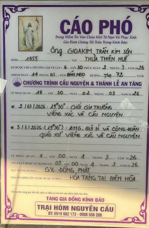 đã được Chúa gọi về lúc 06g30 ngày 02/3/2026 tại giáo xứ Đồng Phát, Quảng Phát, Quảng Tiến, Trảng Bom, Ðồng Nai, hưởng thọ 72 tuổi.